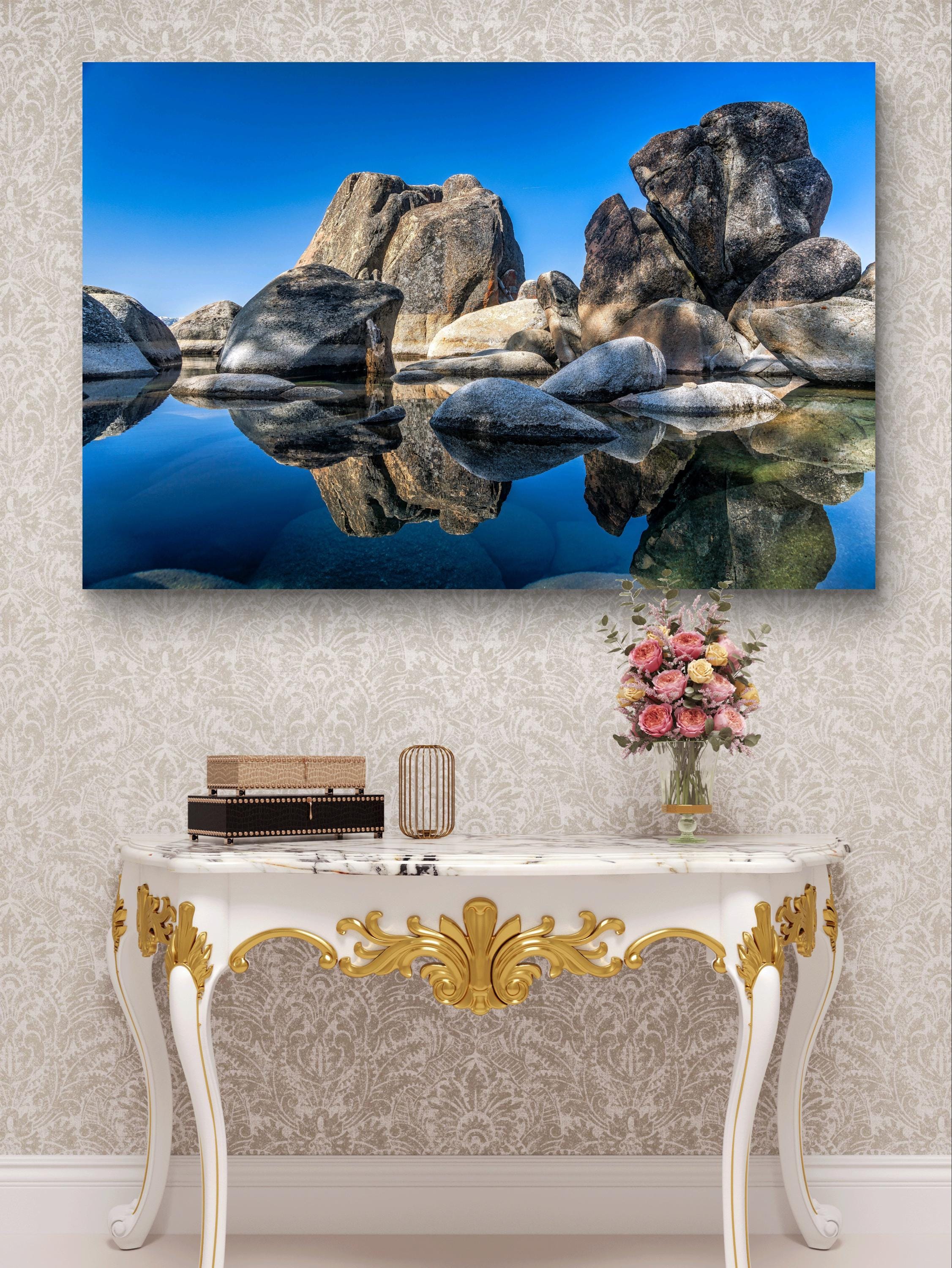 Morning Mirror, Lake TahoeThis magical location received a fresh dustiing of snow just a few days earlier. So, even though I ventured nearby on that slippery day, I did not risk climbing down these rocks. But, in the Spring, the conditions change quickly! And so it was that the image presented itself to me, just an inch above the water! <br>Art is affixed to a thick protective acrylic block giving a three dimensional appearance. A french cleat is attached to the back for easy hanging. Care instructions: Wipe clean with a damp cloth.
